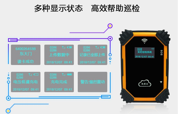 4.通讯方式:GPRS实时传输,在保持设备可靠性和耐用性的前提下一定限度降低了操作人员的疲劳度,抗震动和抗滚落方面有出色的表现。行业内首款W输/GPRS传输实时在线巡检器。支持远距离读卡,可自动采集巡逻点信息。